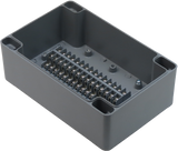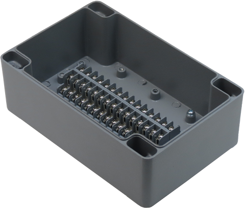 Constructed from Cast Aluminum this Terminal Enclosure is a junction box with integrated terminal block. The Aluminum enclosure with 30 positions is waterproof and it is useful for wiring trunking applications and control connections. Frequent uses include industrial machinery, robotics, welding machines, vessels and automobiles, petrochemical plant facilities, oil feeder and gas supplying facilities. Easy to install, it features molded dimensions for mounting hole locations and grounding screws on the cover and the base.